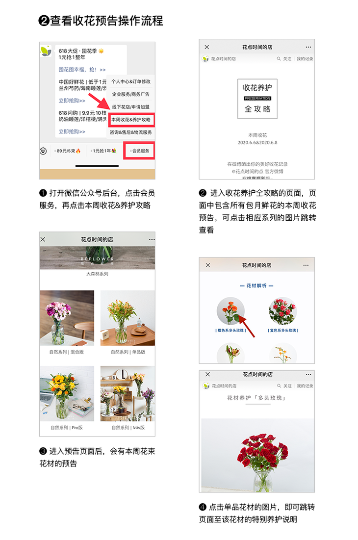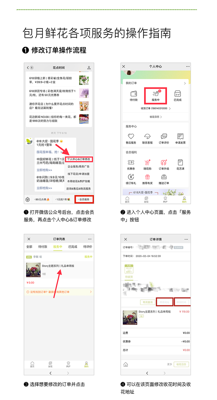 直接搜索公众号"花点时间"并点击"关注",查询物流及鲜花养护信息